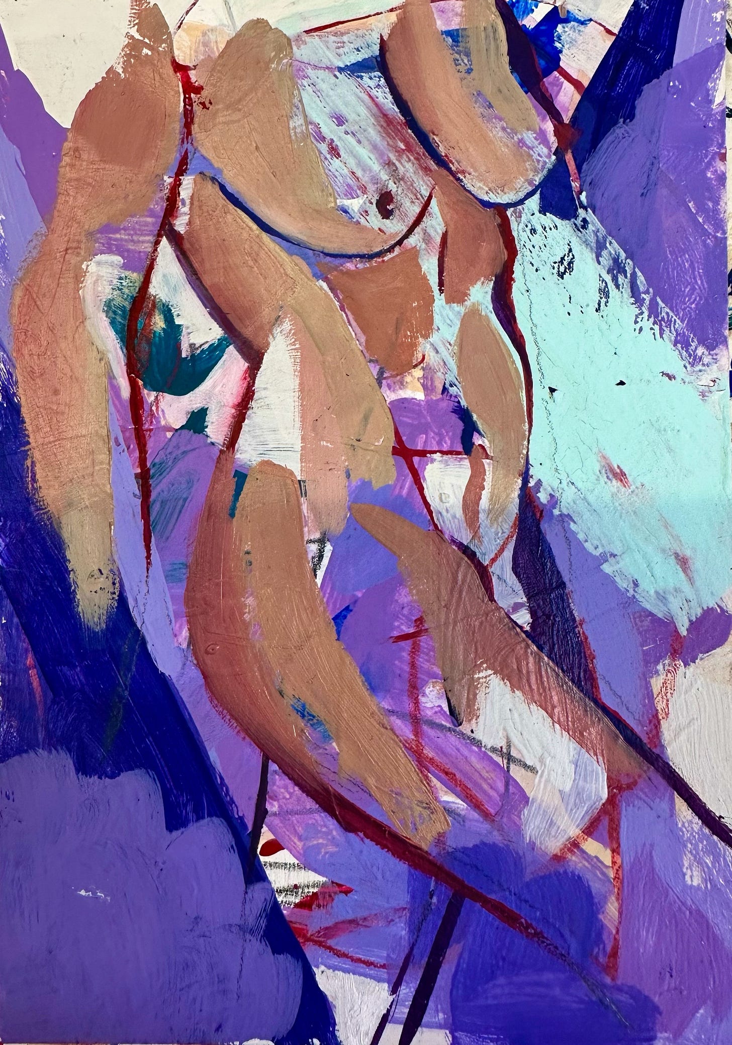 This January I produced a range of postcard-size figurative studies and started to work with text. What I notice, now stepping back, is my use of colour has changed. Before, I used a lot of dark teal. Now lilac and red has entered my palette. As I step back and analyse the work, I smile. Times were changing; I’d met the perfect man and was finally in love, and it showed in my work. The text I used had a lyrical feel to them about love and my love of art.